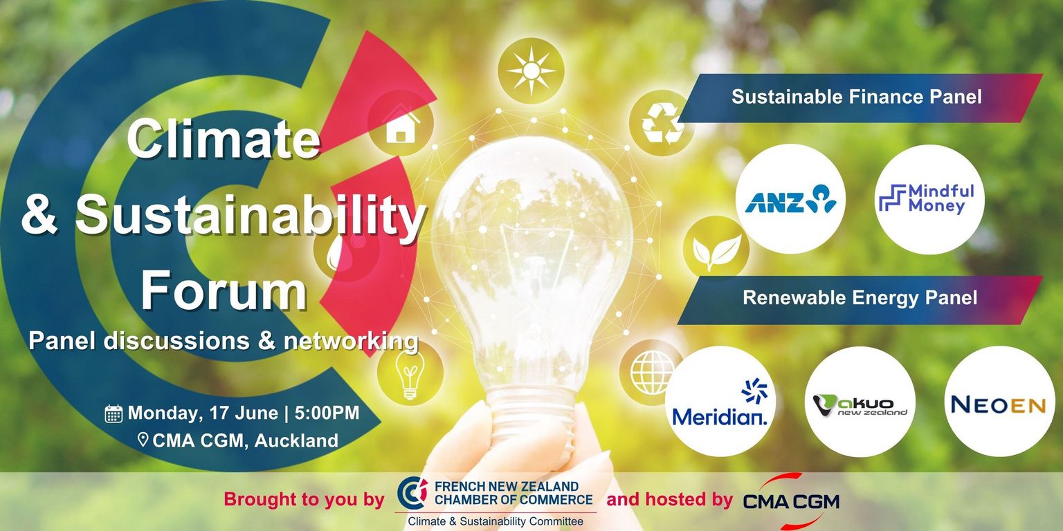 We will be joined by expert panelists from ANZ and Mindful Money (Sustainable Finance) and Meridian Energy, Akuo and NEOEN (Renewable Energy), as well as special guests HE Laurence Beau (French Ambassador to New Zealand), Stéphanie Morley (Trade and Investment Commissioner, Business France) and Gary Carter (General Manager, CMA CGM), our host for the evening.