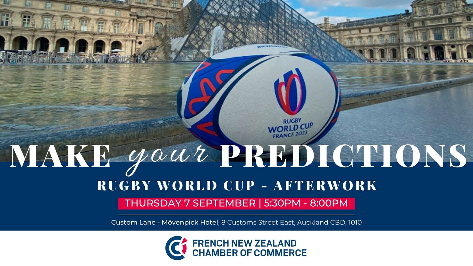 The French New Zealand Chamber of Commerce and Industry (FNZCCI) would like to invite you to the event 'Make your predictions - Rugby World Cup Afterwork' in Auckland. We will welcome you on Thursday, 7th September from 5:30pm at Custom Lane in Mövenpick Hotel.