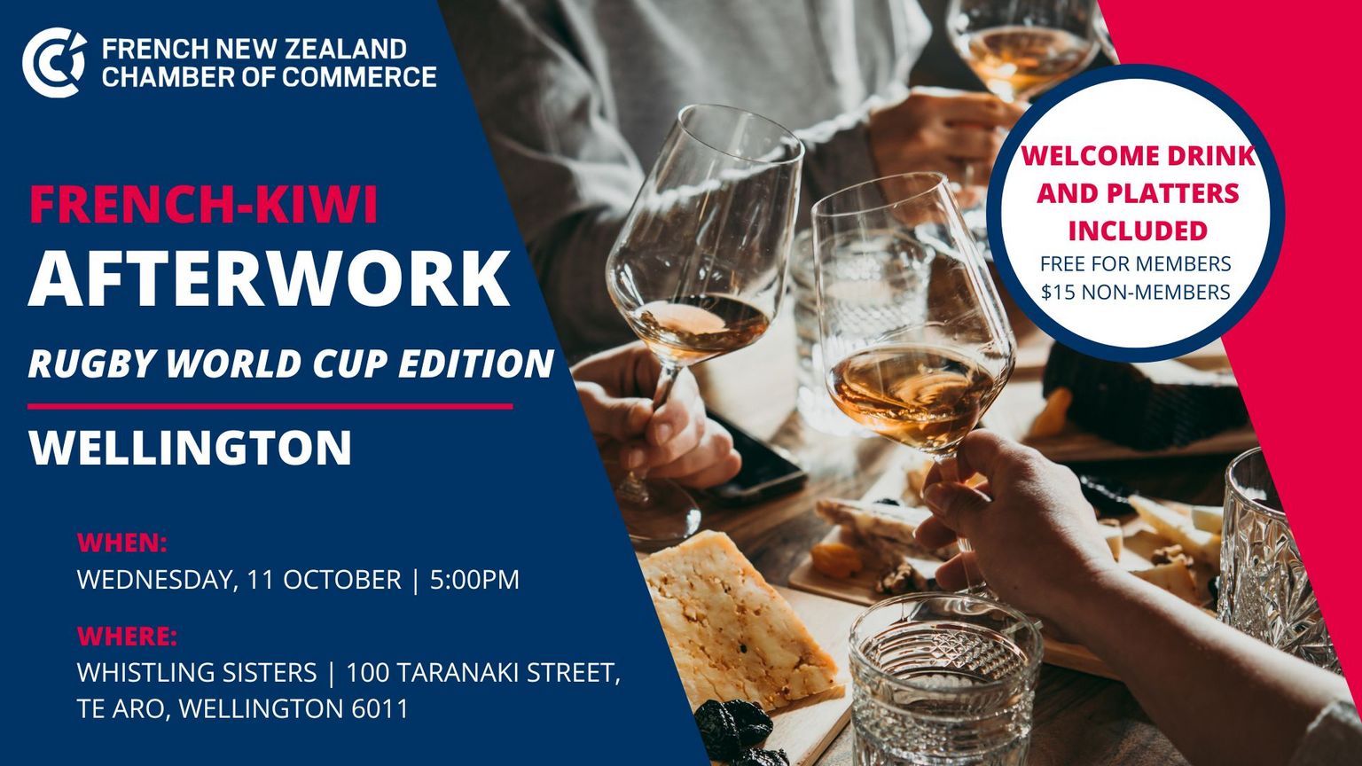 The French New Zealand Chamber of Commerce and Industry (FNZCCI) would like to invite you to attend its special Rugby World Cup French Kiwi Afterwork in Wellington. This will be your opportunity to hear about our recently news, next events and to facilitate a closer relationship and promote French culture and business activities in New Zealand. French Kiwi Afterworks are open to members and non-members. They are a great way to connect with the French-Kiwi community in an informal and friendly setup.